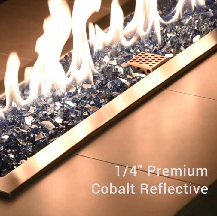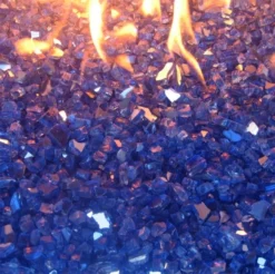 Our ¼” Cobalt Blue Fire Glass is not just gorgeous to behold, but also very practical. It does a great job of covering the entire floor of a fire feature, effectively hiding the unseemly pipes and tubes that are sometimes visible in gas fireplaces and fire pits. This makes fire glass a more desirable alternative to the more commonly seen ceramic logs and fire stones. This reflective fire glass is tempered in order to withstand temperatures of up to 1300° Fahrenheit and harsh weather without losing its color or shape.
