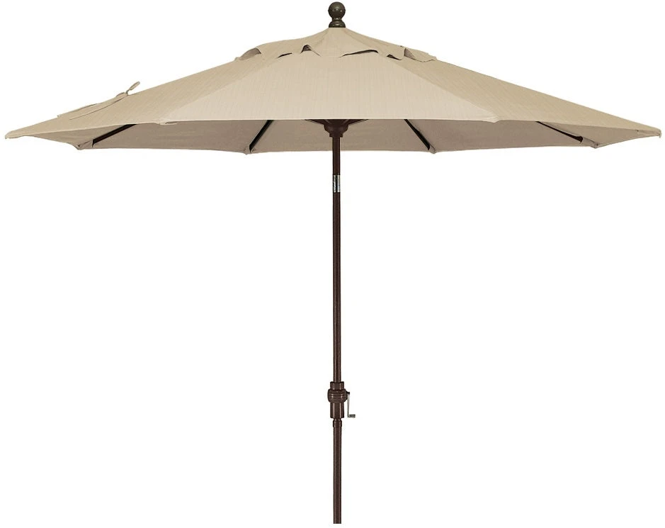 The deluxe crank 9′ Auto Tilt Market Bronze Frame Cream Walnut Canopy Umbrella Thin Pole is our best-selling style. This umbrella has a multiple-tilt feature that utilizes the crank handle to raise/lower the umbrella and adjust the angle of the canopy for the desired shade.