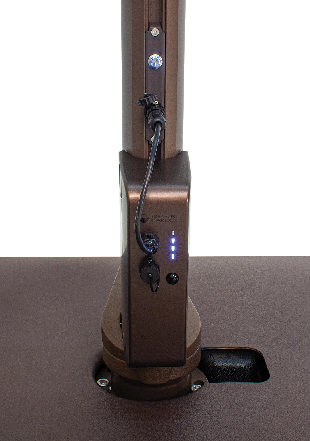 The 9′ Starlux Collar Tilt Market Umbrella in a Bronze Frame with a Taupe Canopy has lighting built into the ribs to create the perfect ambiance for your next party or gathering. The umbrella comes with a 110/12V/DC UL approved indoor/outdoor transformer, and the lights are tested for 50,000 lifetime hours.