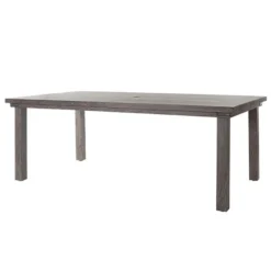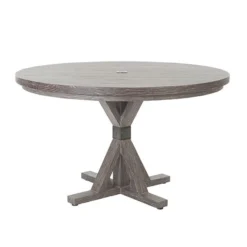 - Round Lago Table features an umbrella hole, textured wood-grain finish and Carbon finish accents