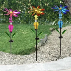 Our solar-powered Bejeweled Metal Spinning Floral Stake Light features artisan craftsmanship. Place this solar garden art on your patio for instant enjoyment. This solar garden light will be ready year after year to provide a warm glow to your home.