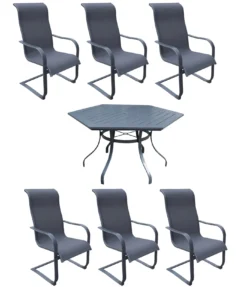 Enhance your outdoor dining experience with ourĀ Dublin Spring Patio Dining Set. Designed for top of the line luxury, this set features dining chairs with high backs and comfortable sling seating. The relaxing C-spring motion and softĀ fabricĀ make these chairs ideal for porches, patios and sunrooms.Ā