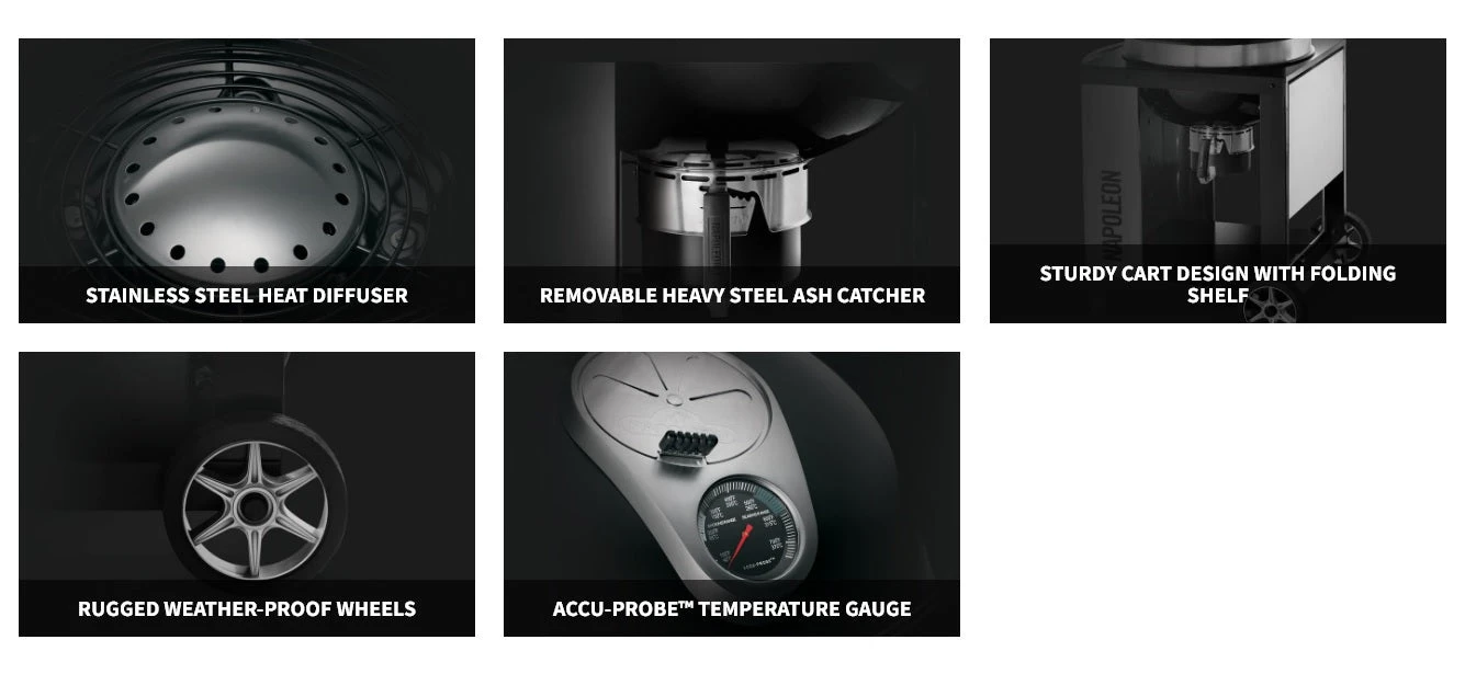 Charcoal enthusiasts can experience a full-sized grilling experience with the compact and mobile Napoleon PRO Charcoal Kettle Grill with Cart. Charcoal is all about controlling heat and airflow, the cooking grids adjust to three heights, while the stainless steel heat diffuser evenly distributes heat, and directing spent charcoal to the ash catcher. The lid features an offset hinge that opens, allowing access to the whole grill while keeping your hands away from the heat.