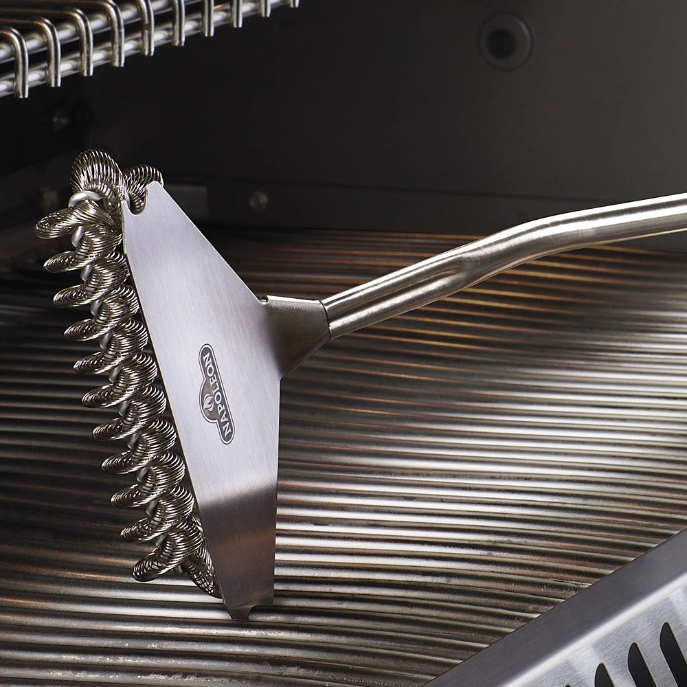 Keep your stainless steel cooking grids clean with this Napoleon Bristle Free Grill Brush featuring an extra wide design and grid scraper. The curved handle design adds extra leverage when scrubbing and the built-in hook means your grill brush is always within reach.