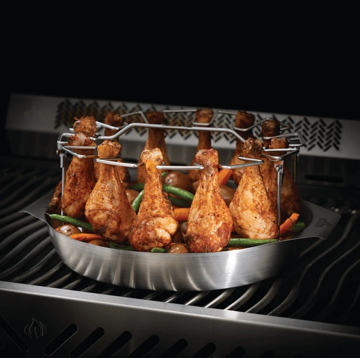 Napoleon’s Chicken Leg Grill Rack is ideal for one-pot meals and versatile enough to make many dishes at once, like chicken and paella. The upright rack allows for even cooking, holding up to 12 poultry legs or wings upright. Use the topper as a drip pan or to cook side dishes simultaneously or separately.