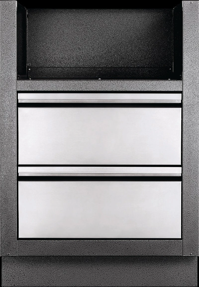 Specially made for the Built-In 700 Series Gas Grill Heads, this carbon colored, powder-coated, galvanneal cabinetry features increased durability from the two-coat pebbling finishing system.Ā A dual bank of stainless steel drawers are mounted on smooth gliding tracks for under grill storage. Installation is a breeze with knockouts for gas and electrical. Leveling feet ensure a balanced surface, even if your patio isn’t perfectly level.