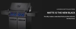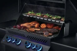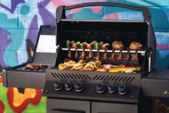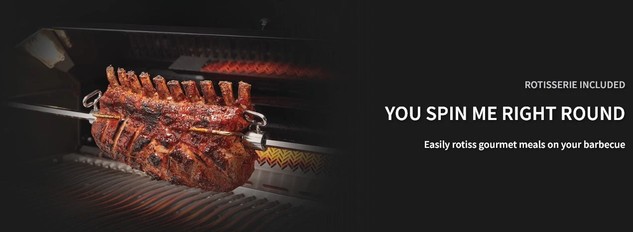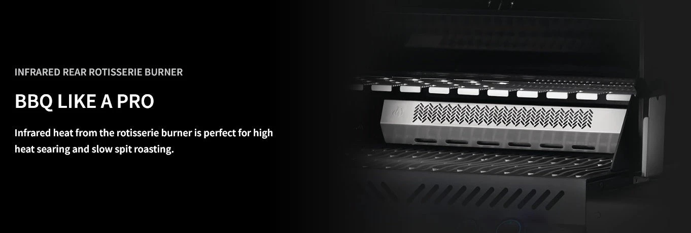 - Infrared heat from the rear rotisserie burner is perfect for high heat searing and slow spit roasting