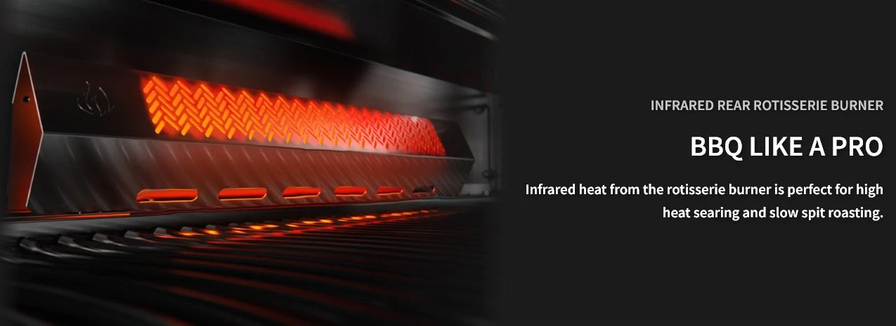 - Infrared heat from the rear rotisserie burner is perfect for high heat searing and slow spit roasting