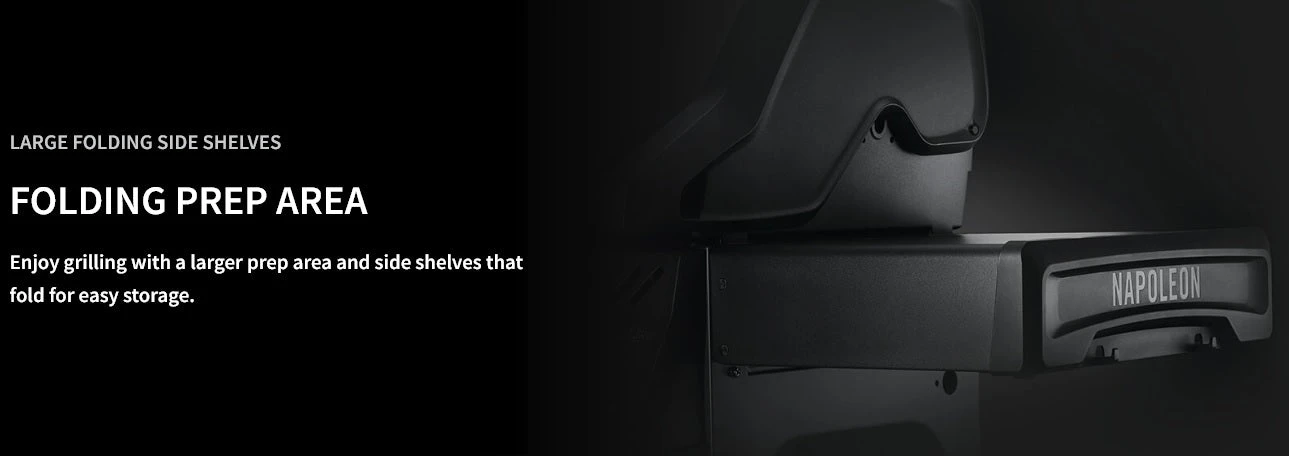 - Enjoy grilling with a larger prep area and large side shelves that fold for easy storage