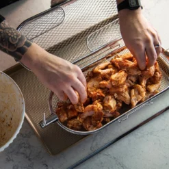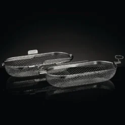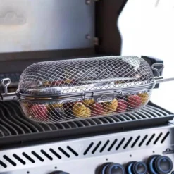 The Napoleon Rotisserie Basket‘s rod ports fit most rotisserie rod styles and lock in place with the thumb screws. Once you’ve created the most delicious wings, crispiest fries and grill roasted veggies without the addition of oil, the stainless steel baskets clean up easily, then nest for space saving storage.