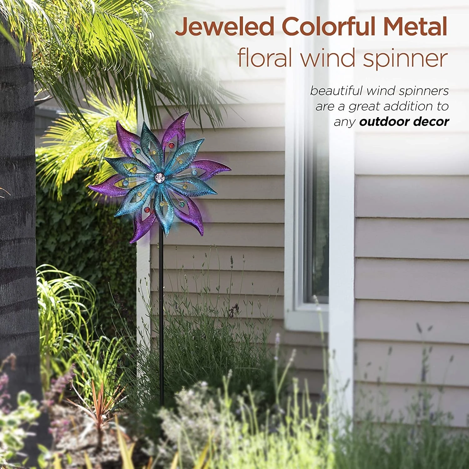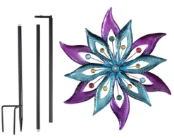 Add a touch of ambience to your patio, lawn or garden with this Floral Windmill Stake. This durable, colorful spinner is made of metal to withstand the harshest wind conditions and last throughout all seasons. The fashionable purple and aqua colors are adorned with plastic gems and are a stylish addition to your outdoor space. The colors blend together as the wind swirls the spinners to create a beautiful color collage.