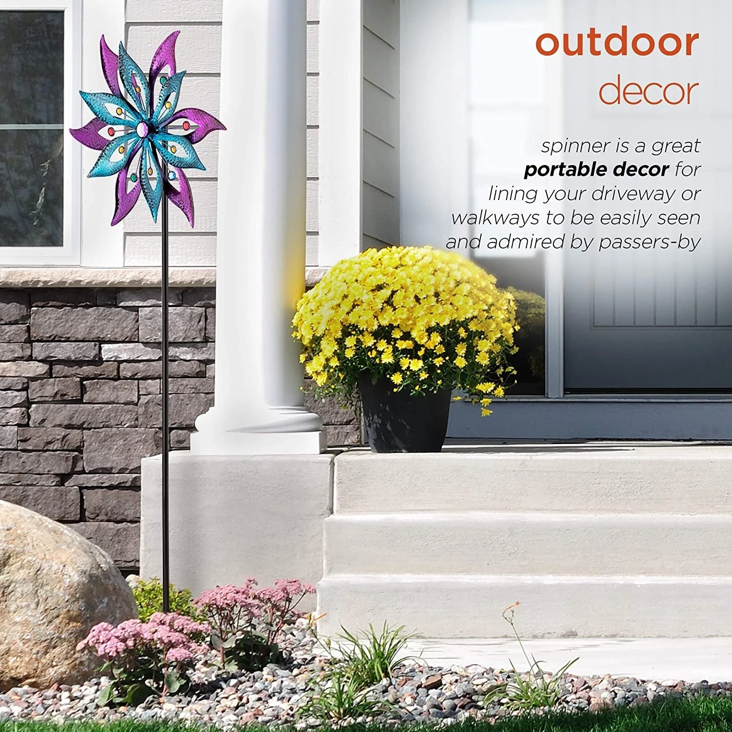 - Durable, colorful lawn spinner