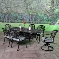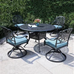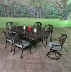 Revitalize your outdoor table area with this Shoreline Cast Aluminum Cushioned Patio Dining Set that is well-designed AND has modern appeal. The elegant sensibilities of French Quarter architecture are now realized in this Shoreline Collection, a solid cast aluminum collection with a remarkable presence.