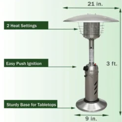 Perfect for outdoor entertaining, our Stainless Steel Table Top Propane Patio Heater provides warmth while adding ambiance to any outdoor table top setting. This handsome unit raises the outdoor temperature 10-25 degrees.