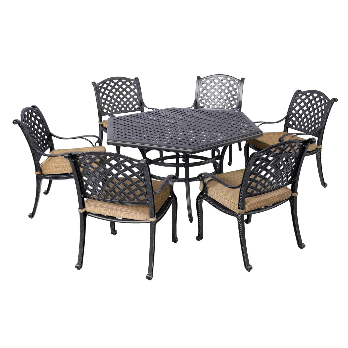 Our stylish Stonegate Cast Aluminum Cushioned Patio Dining Set offers durability and quality, as well as a timeless look. High-performing cushions and powder-coated aluminum frames keep the mood carefree and fun.
