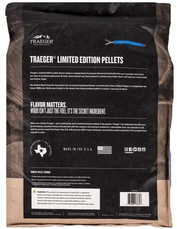 Bring big flavor to your next backyard BBQ with Traeger Brisket Blend Pellets. Traeger’s limited edition pellets feature artisanal blends of American hardwoods that were carefully selected to elevate the flavor of your food and help you create unforgettable meals.