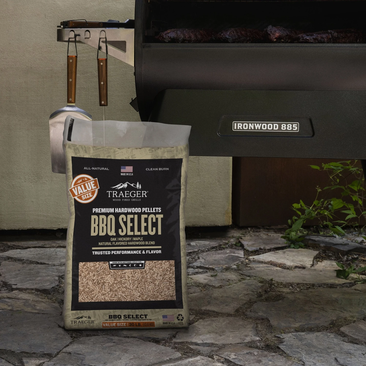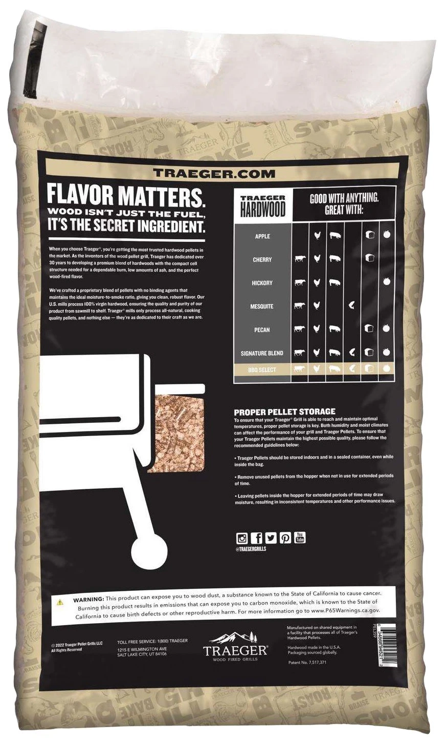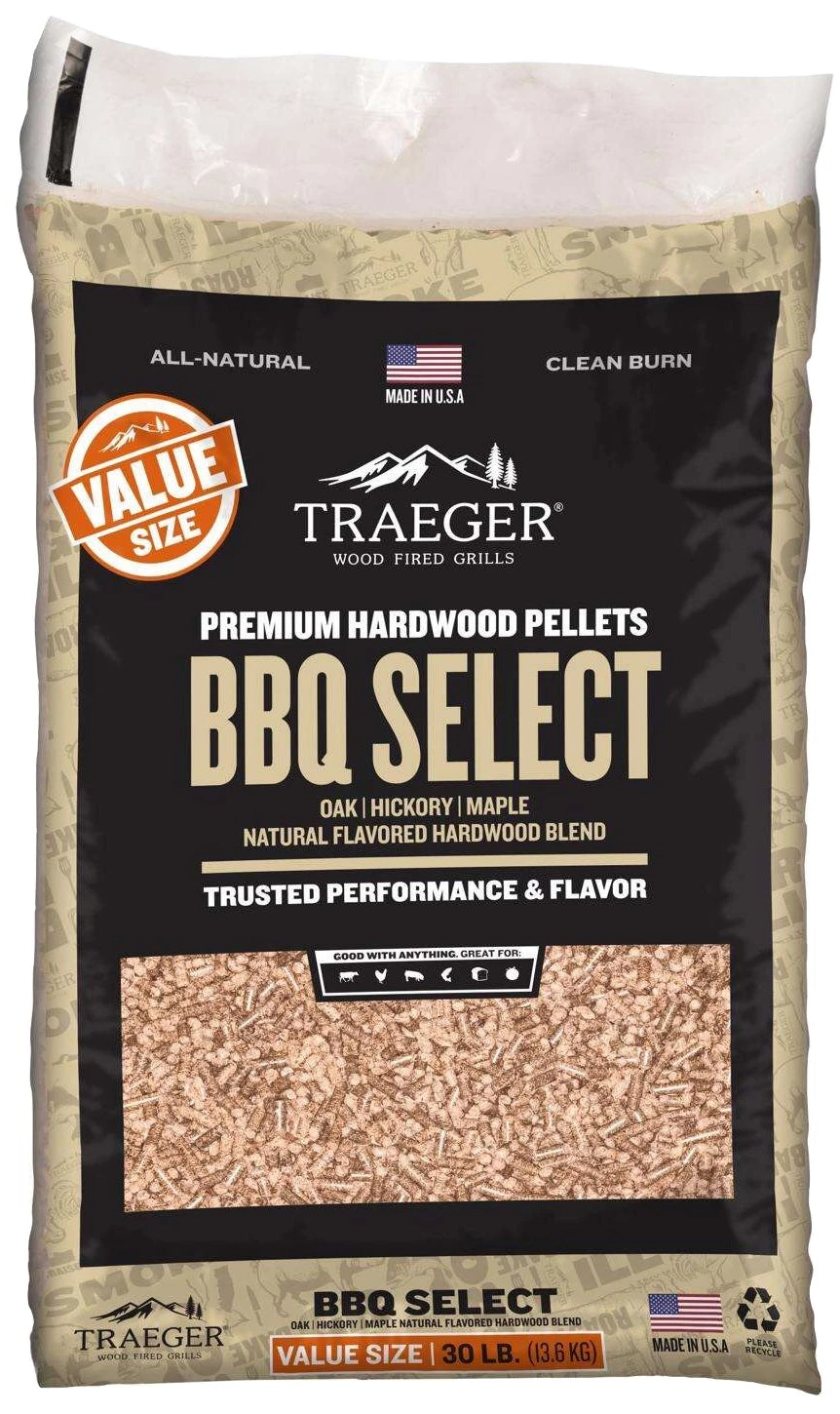 Cook longer and more often with Traeger’s BBQ Select Hardwood Pellets. These pellets feature 50% more pellets than Traeger’s standard 20 lb. bags to give you more cooks per bag. The blend features the all natural flavors of oak, hickory and maple to offer a versatile smoke taste that enhances the flavor of all your wood fired foods.