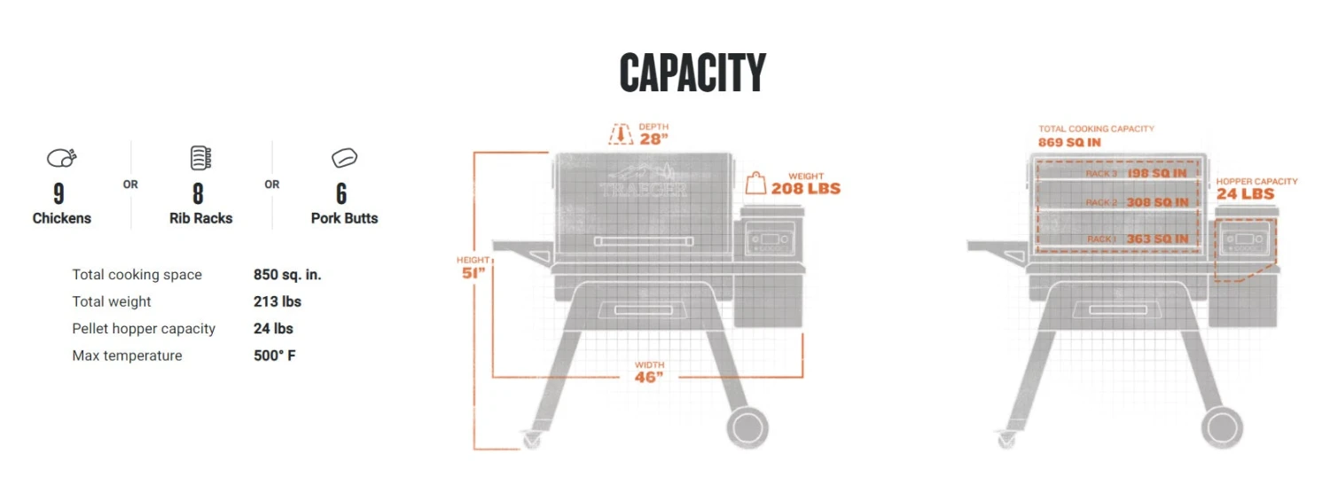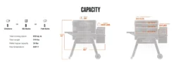 - Total cooking capacity of 850 sq. in. (for example: 9 chickens, 8 rib racks and 6 pork butts)
