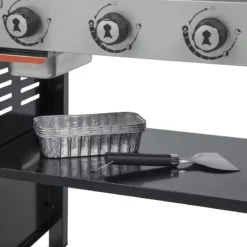 This spacious griddle includes 2 side tables to prep, serve and keep tools handy, while the griddle itself gives you space to cook an entire meal at once, so all of your food is ready at the same time. Its high-capacity grease management system helps prevent spills, making cleanup a snap.