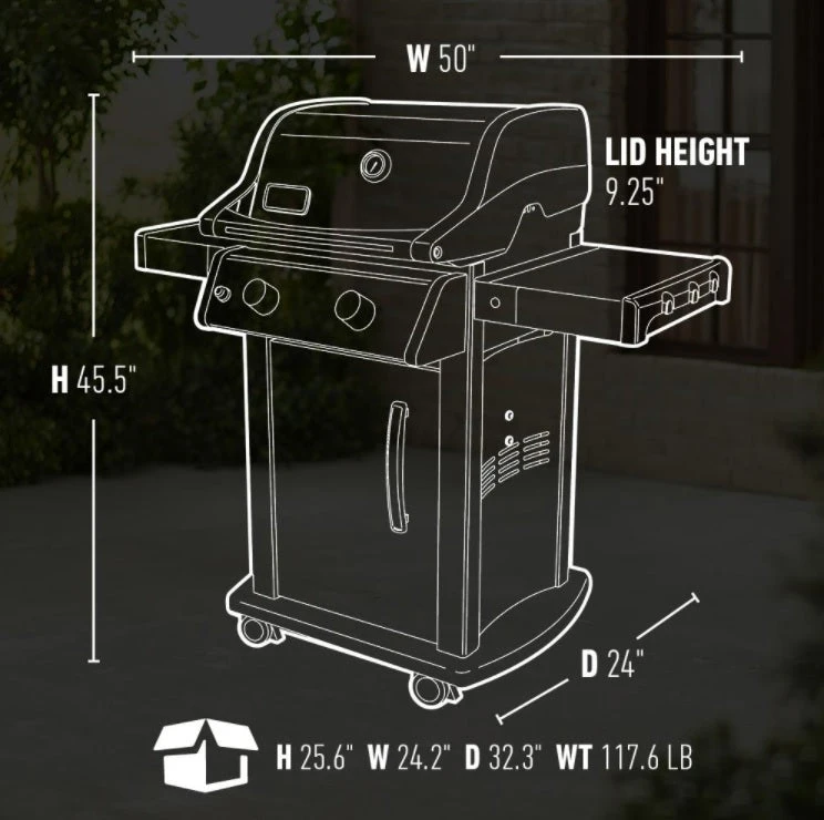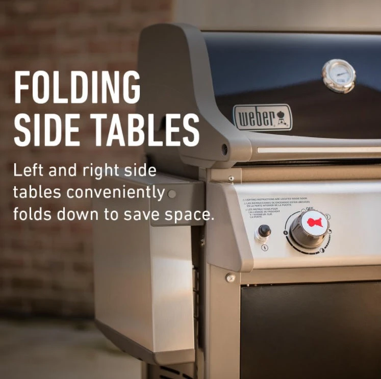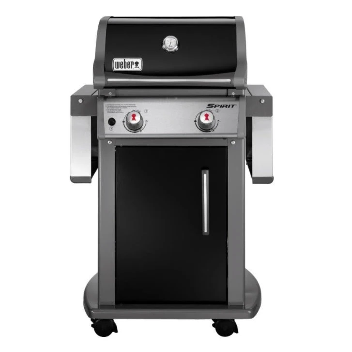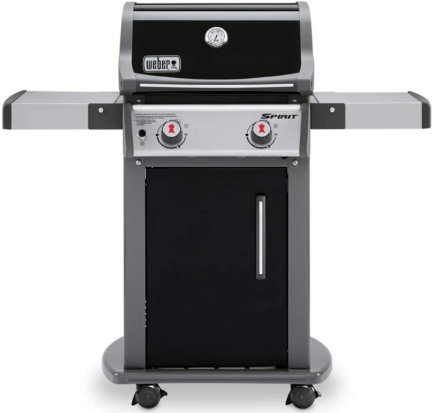With the control panel moved to the front, the design of Weber’s Spirit E-210 2-Burner Propane Gas Grill includes two stainless steel tables that fold down for easy maneuverability and storage and boon for grillers with small patios, decks or balconies. While compact, the BBQ grill is also roomy enough to cook a 20 lb. turkey or roast meats and vegetables at the same time. Porcelain enameled cast-iron cooking grates offer superior heat retention and quick clean-up, while the porcelain-enameled shroud won’t fade, peel or rust.