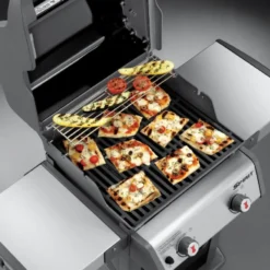 - Porcelain-enameled, cast-iron cooking grates designed to cook food evenly