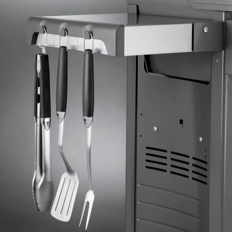 - (2) stainless steel fold-down tables with integrated tool hooks allow for easy access to your grilling tools