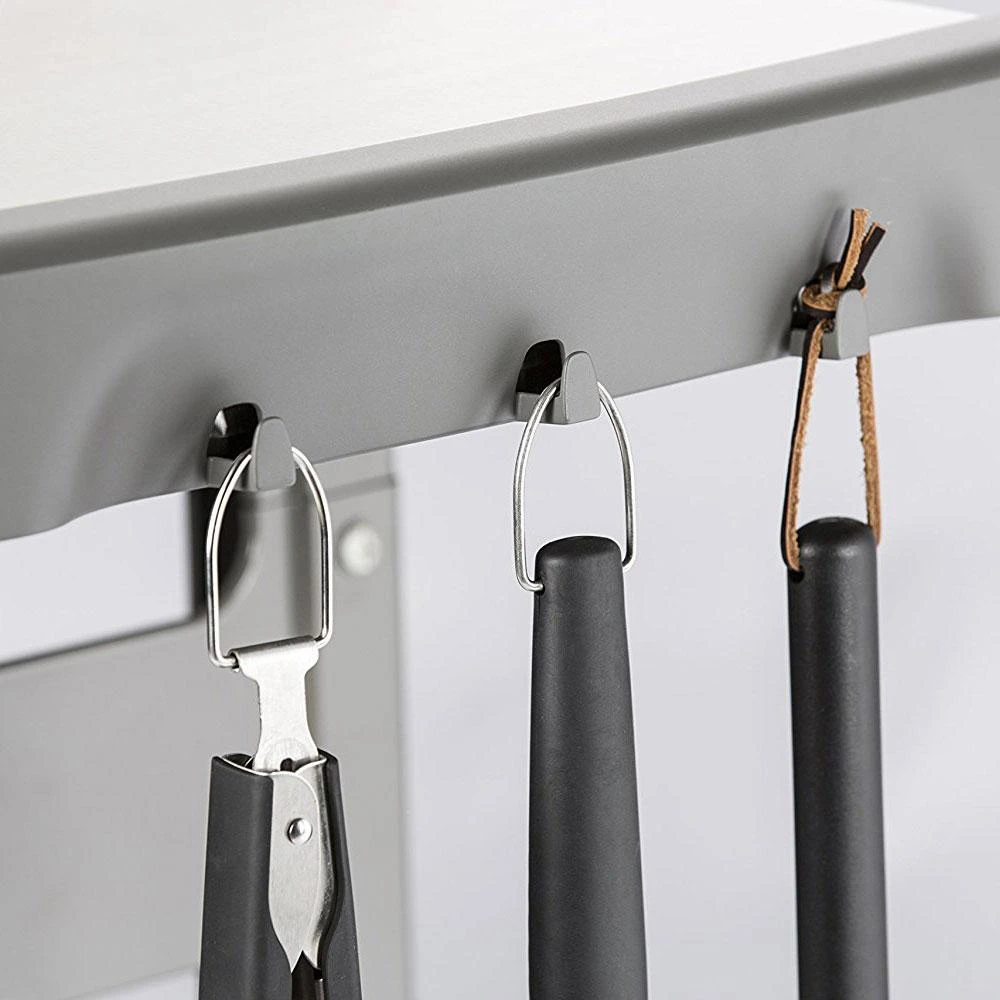 - Features 2 fold-down side tables, 2 durable all-weather wheels and 6 hooks