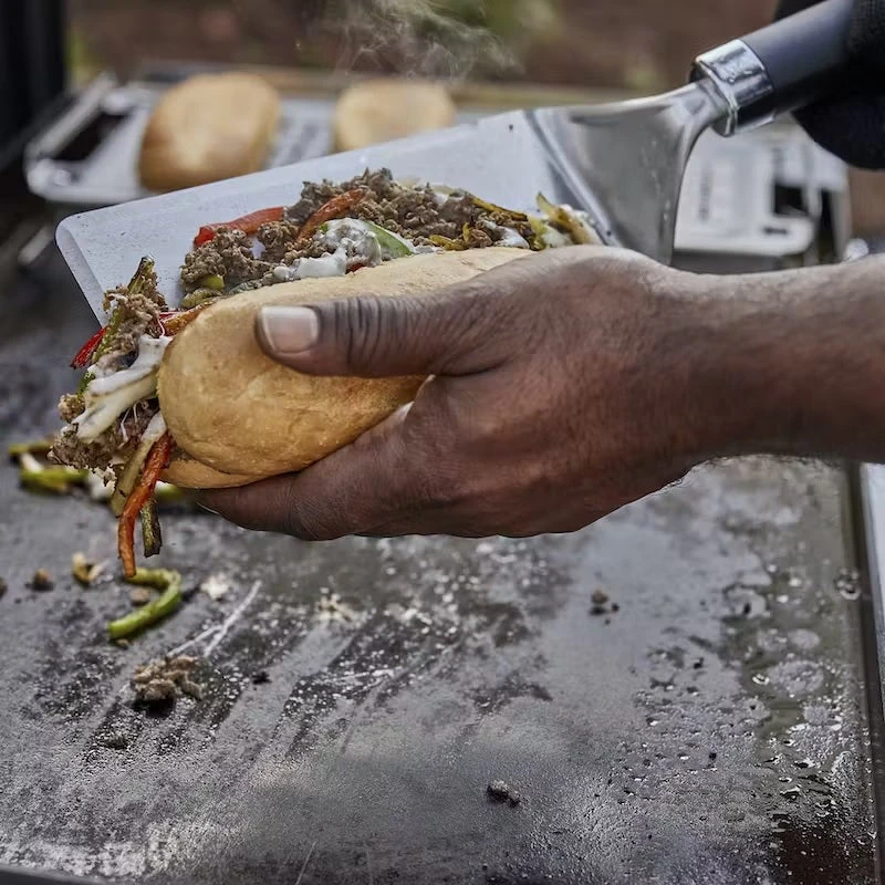 From the no-slip, easy grip handle to the beveled edge that easily slides under food from any direction, the Weber Griddle Spatula helps you maneuver your cooking with comfort and ease. The handle is also elevated so you don’t have to worry about it resting on messy side surfaces.