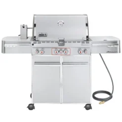 Let your homemade BBQ sauce simmer on the side burner to compliment the golden brown rotisserie chicken under the lid. The 4 burners, large cooking area, and abundance of features in the Weber Summit® S-470 Gas Grill is what every grill master strives for.