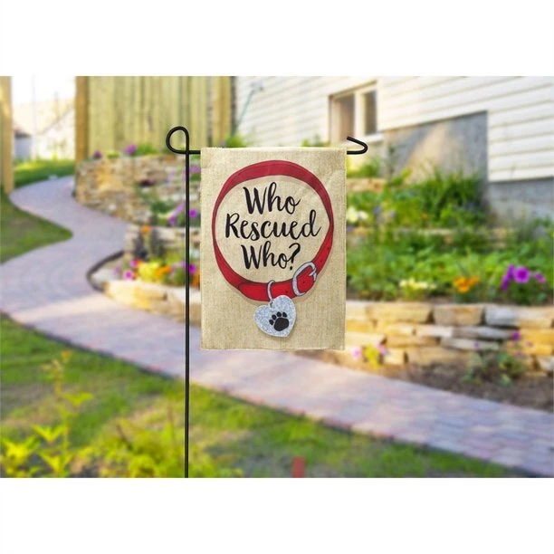 This pet rescue themed Burlap Boutique™ Garden Flag features heavy burlap textured fabric with a pet collar and “Who Rescued Who” printed on both sides of the flag so the lettering reads correctly from both sides as well. The heart charm is attached to the collar on both sides in a way that allows it to dangle and offer a bit of a 3-D effect. Show how much you love your rescue companion and display this cool, eye-catching flag at your home, animal clinic or rescue center.